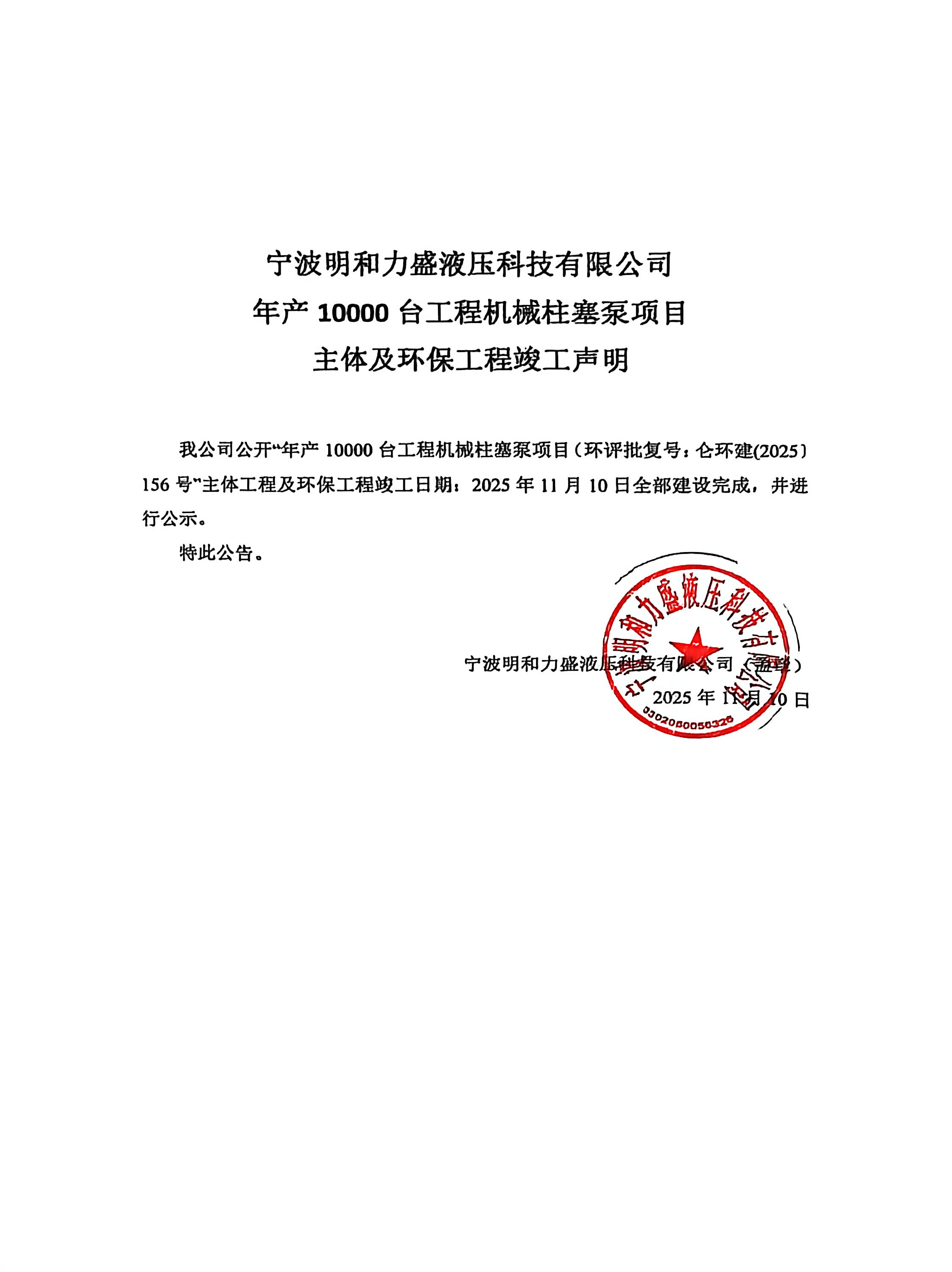 宁波明和力盛液压科技有限公司公开“年产10000台工程机械柱塞泵项目(环评批复号:仑环建(2025〕156号”主体工程及环保工程竣工日期:2025年11月10日全部建设完成,并进行公示。